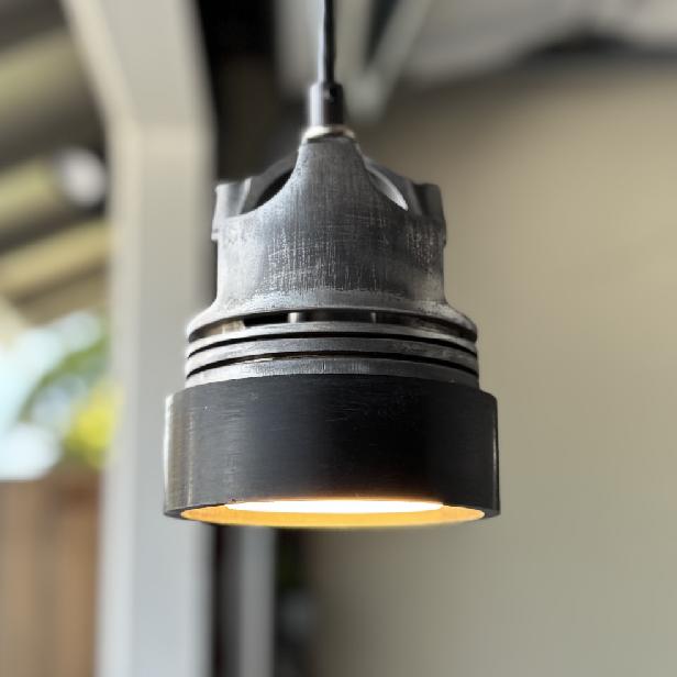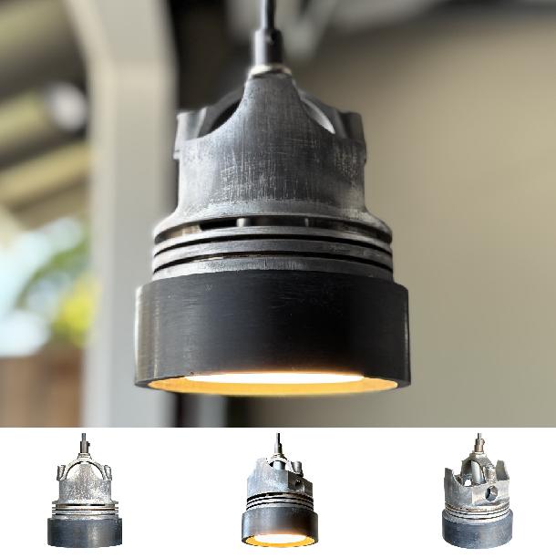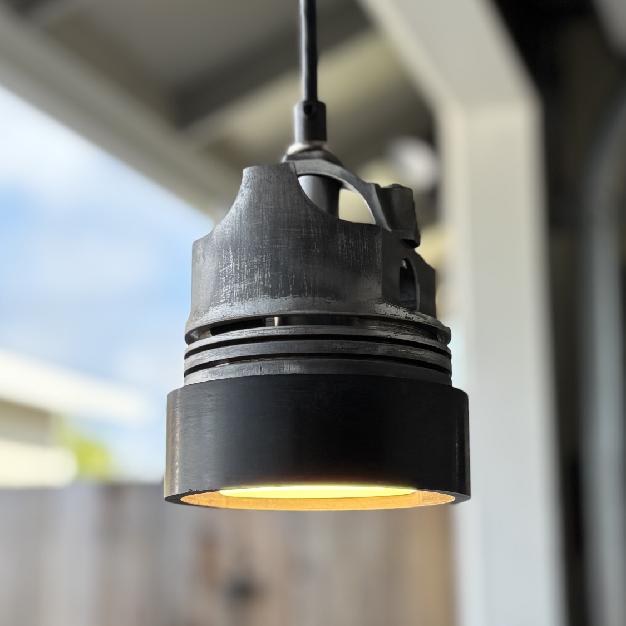 The automotive themed piston light pendant has a vintage industrial look. It is made from a modified piston head and a black ring. The steampunk transportation themed decor makes for a cool kitchen, shop, bar or restaurant fixture. Henry Ford meets Thomas Edison in the showroom lounge. This heavy duty fixture has motor city roots and cleans up real nice. It comes with a recessed 11W 800 lumen puck bulb in black cylinder.