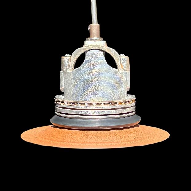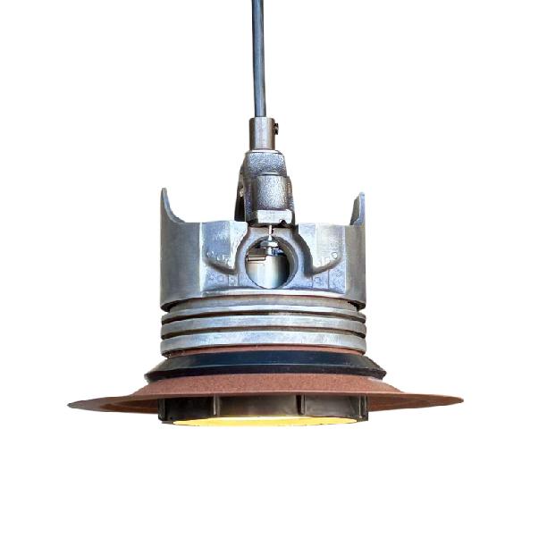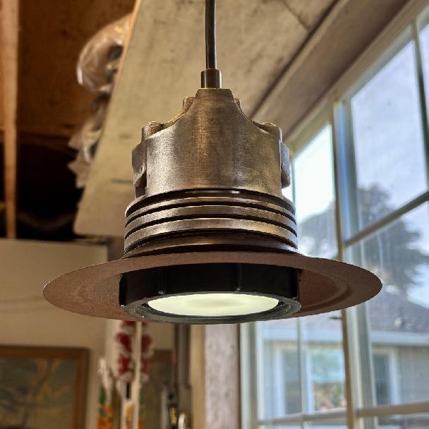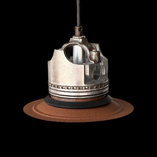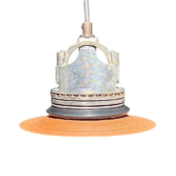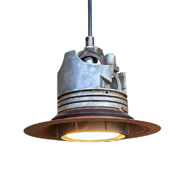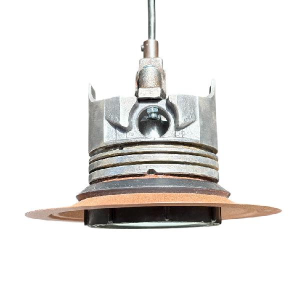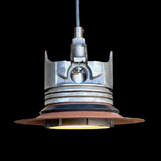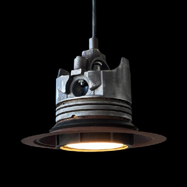 The automotive themed piston light pendant has a vintage industrial look. It is made from a modified piston head with an added metal hood. The steampunk transportation themed decor makes for a cool kitchen, shop, bar or restaurant fixture. Henry Ford meets Thomas Edison in the showroom lounge. This heavy duty fixture has motor city roots and cleans up real nice. It comes with a recessed 11W 800 lumen puck bulb in black cylinder.