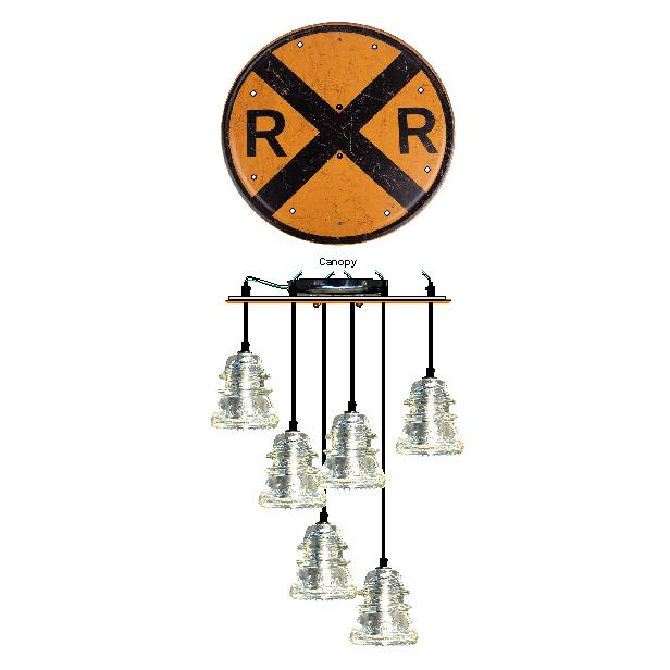 Railroad crossing sign 12″ dia. 22ga steel with  insulator light chandelier. This industrial chandelier adds a distinctive visual decor to your home, restaurant or garage or train room. Achieve a rustic industrial or a modern look that people will notice and appreciate the novel origins especially any railroad workers. The sign comes with a wall 5 1/2″ metal wall canopy to attach to your J-Box. comes with 4- 5′ Black 3 wire cord with cord grip to adjust trim heights of each light fixture.