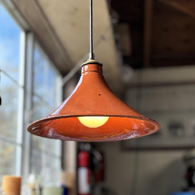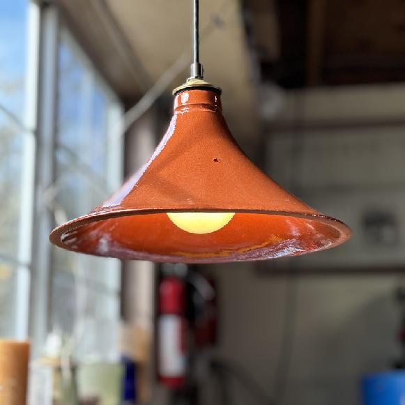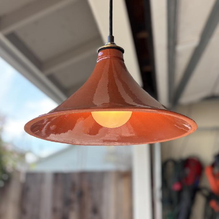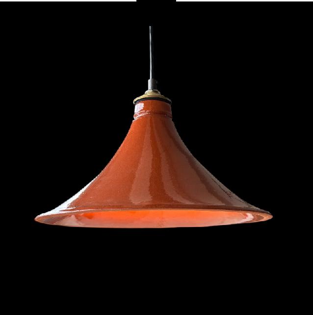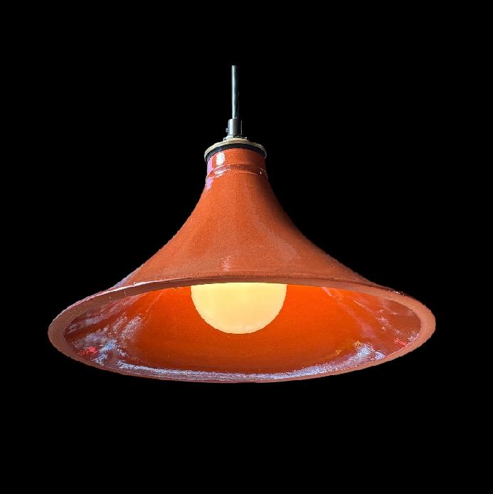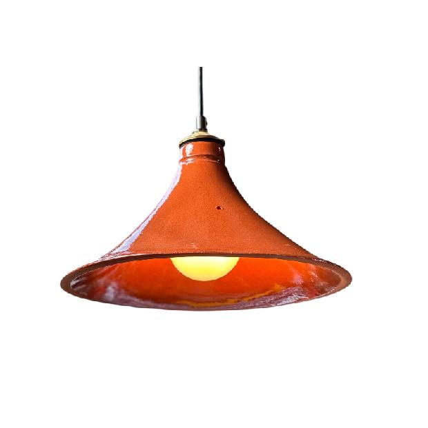 Pendant light fixture made from ceramic cookware. Made from a conical shaped top of a Tagine cookware set. It is ceramic glazed earthenware lighting & decor in the kitchen or restaurant. Friends & customers will recognize and appreciate the kitchen & restaurant utility of this cleaver lighting choice. The classic ceramic shape & glazed finish adorned with a brass cap makes it deal for the kitchen. The illumination is warm, pleasing & easy on the eyes.