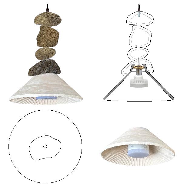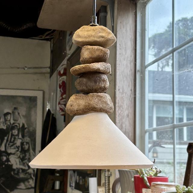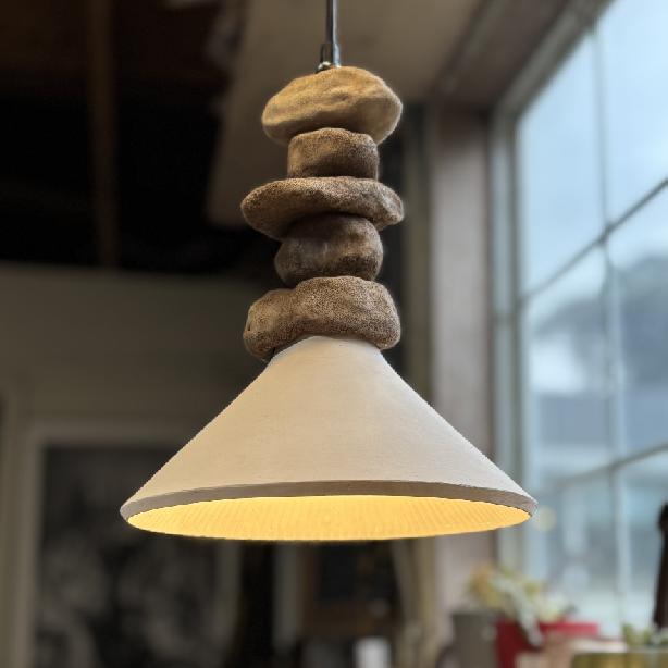 Tagine cookware inspired light fixture with a ceramic cairn rock stack makes a unique pendant light for the kitchen. The conical illuminaire focuses a soft warm light downward. The stacking stones are hollow clay rocks stacked stranded by the cord. (All Bisque fired). Each fixture is an original and there will be variations in hand made clay fixture.